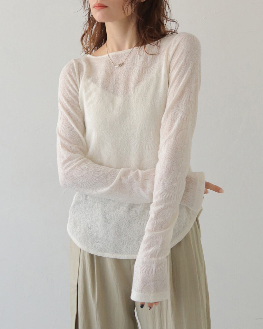 レースジャガード生地を使用した、上品で女性らしい印象のトップス。