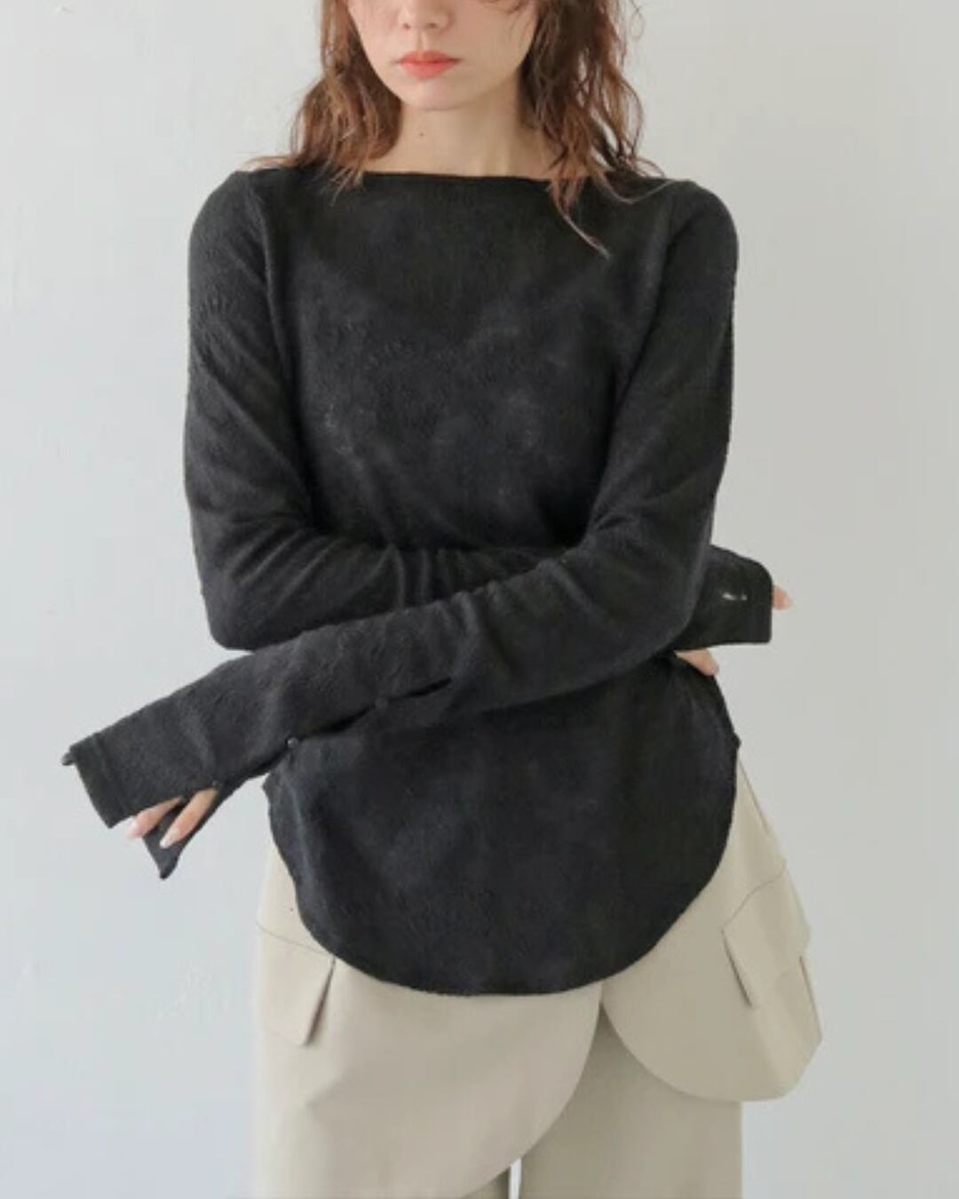 スリット部分には小さなパールボタンをあしらい、シンプル見えしつつもこだわりの見える1枚です。
