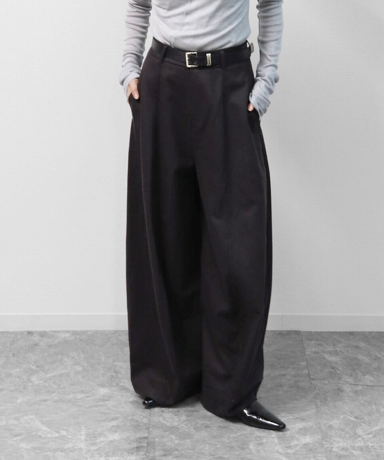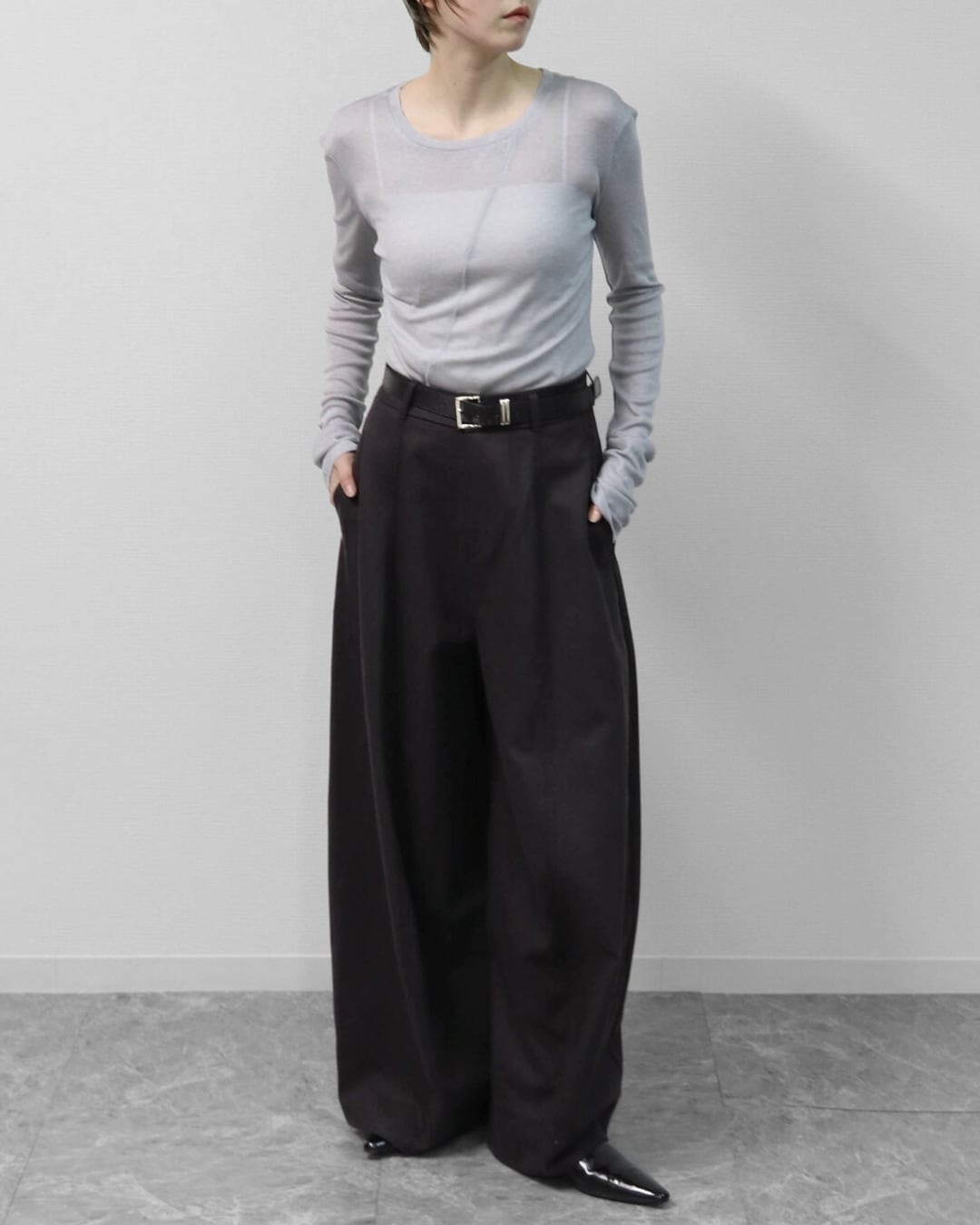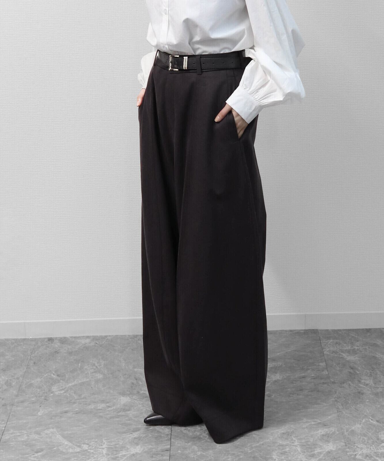 フロントにタックが入っており、腰回りはすっきりと、脚のラインを拾わない大人向けのバランスです。