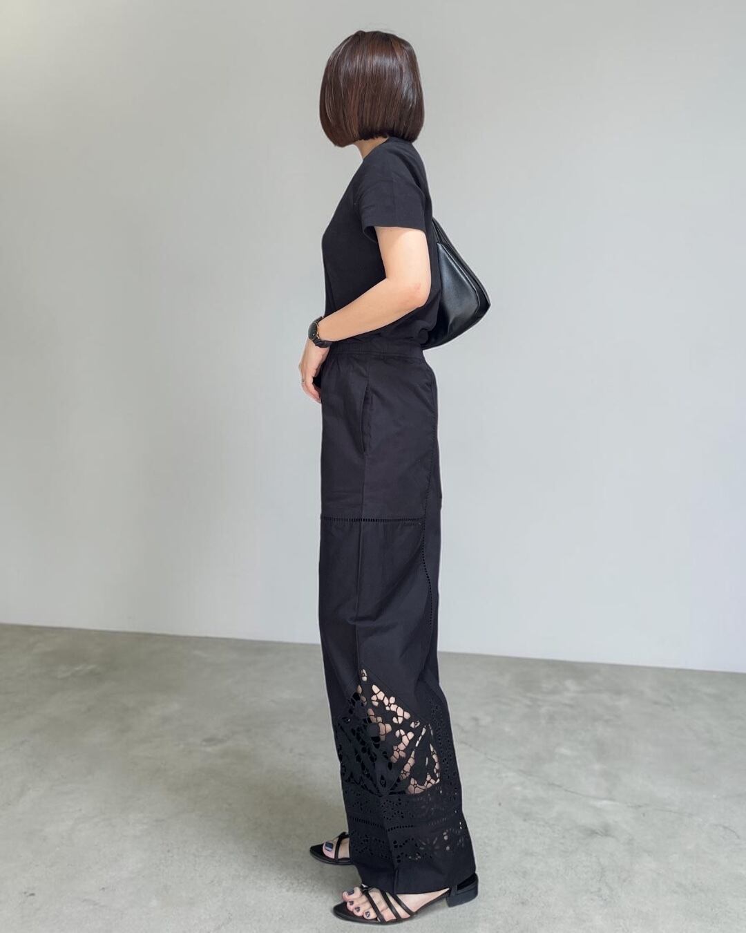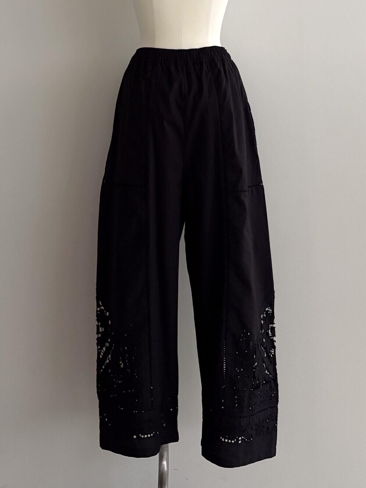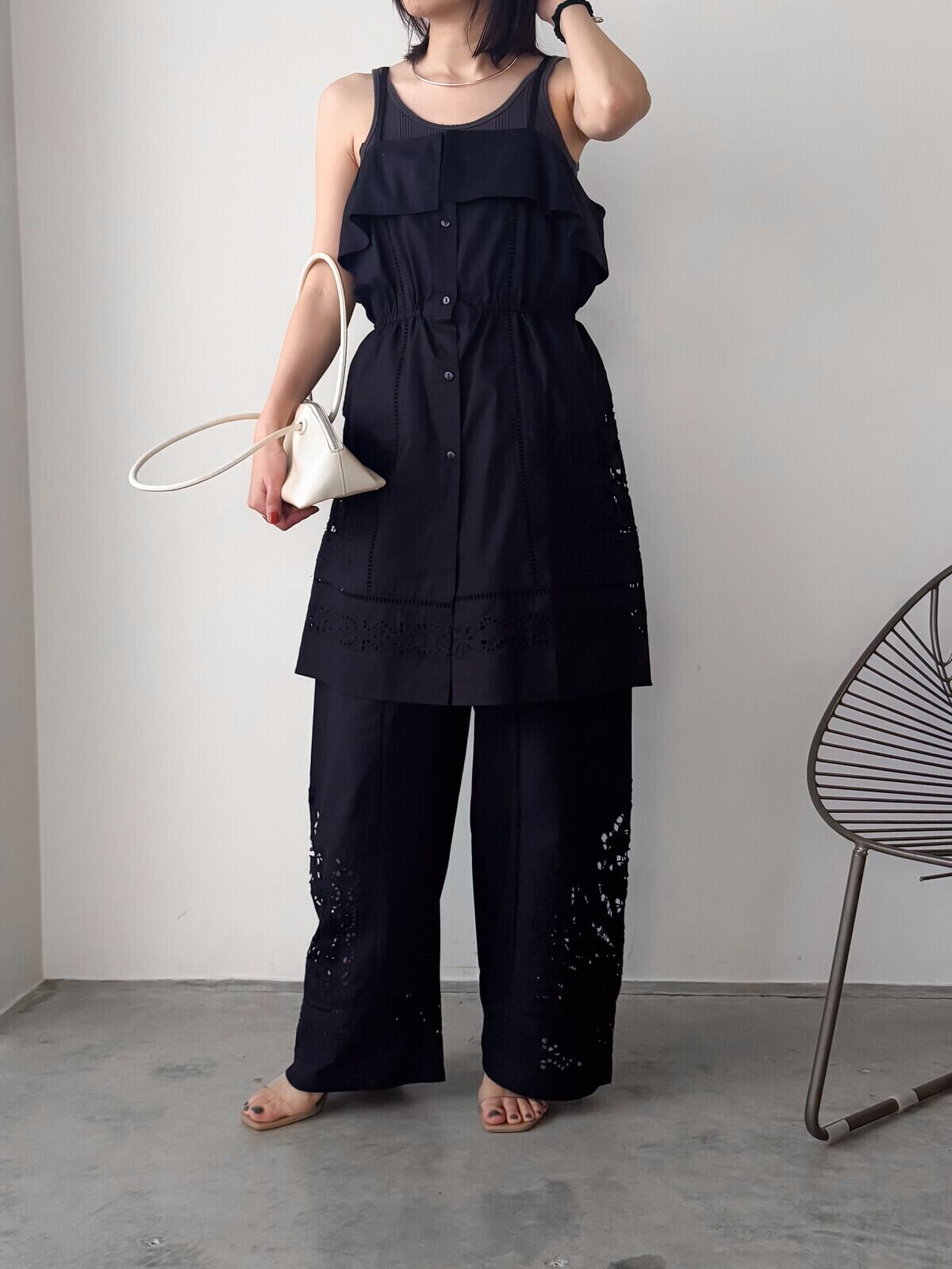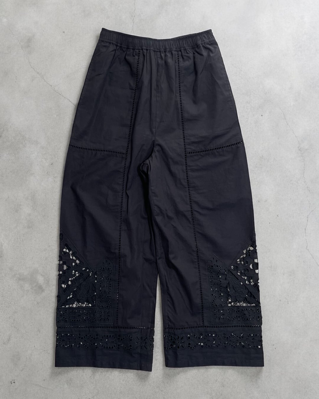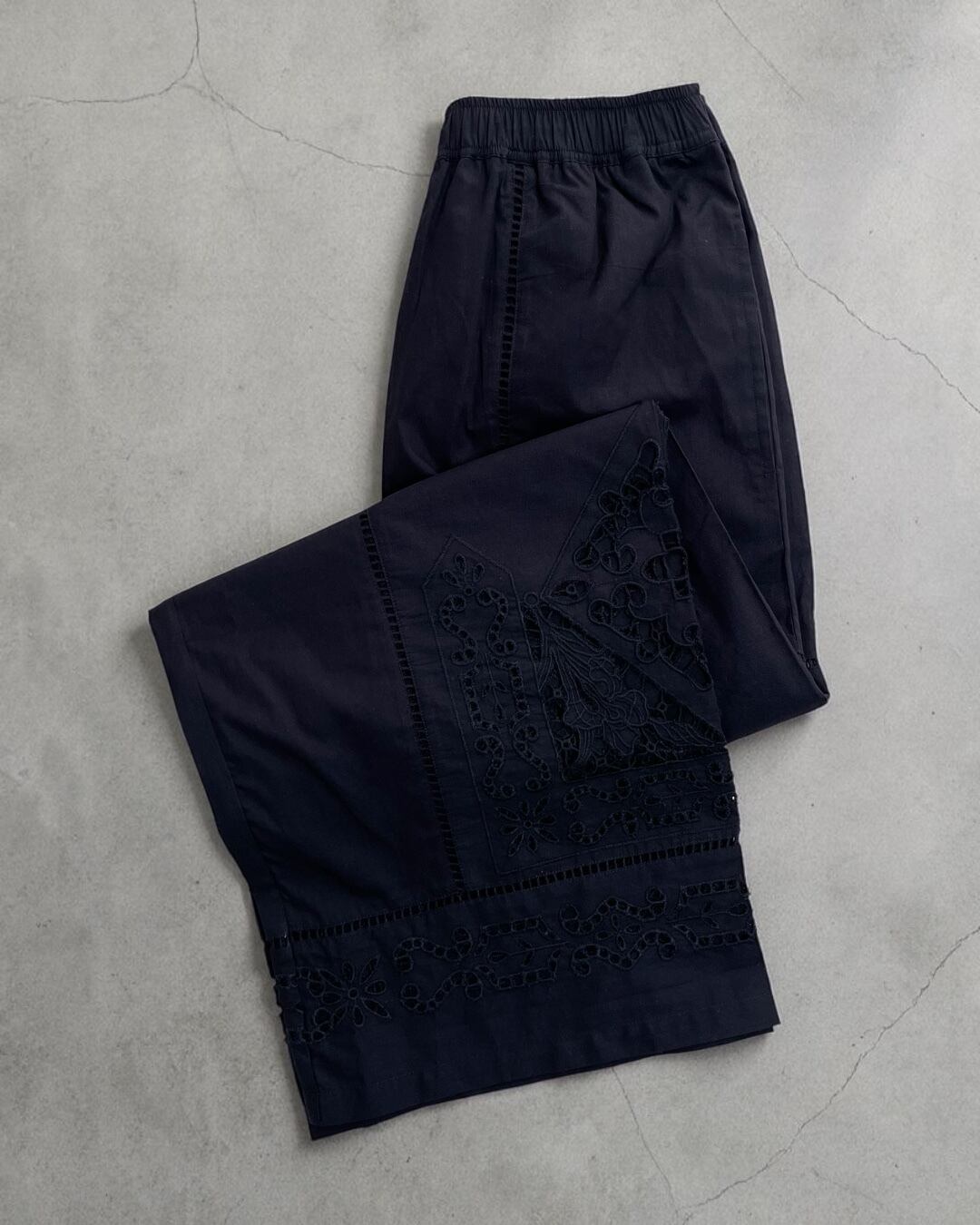 シャツ地にカットワーク刺繍を贅沢にあしらった刺繍パンツが登場です。